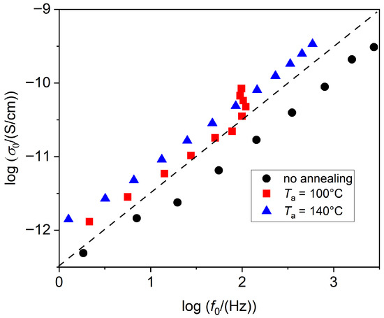 where A is the depolarization factor of the inclusion (1/3 for spherical shape) and ϕ its volumetric fraction in the matrix. Therefore, increased conductivity leads to shorter relaxation times, as observed in our measurements. Indeed, a correlation between conductivity and relaxation frequency can be observed, as shown in Figure 8. In particular, relaxation frequency and conductivity are proportional, consistently with the case where the conductivity of the crystal phase is negligible compared to that of the amorphous phase, that is, when σ1 << σ2. The deviation for the case with Ta = 100 °C is probably due to the interference of the αa process, which could not be discriminated from the slow process.