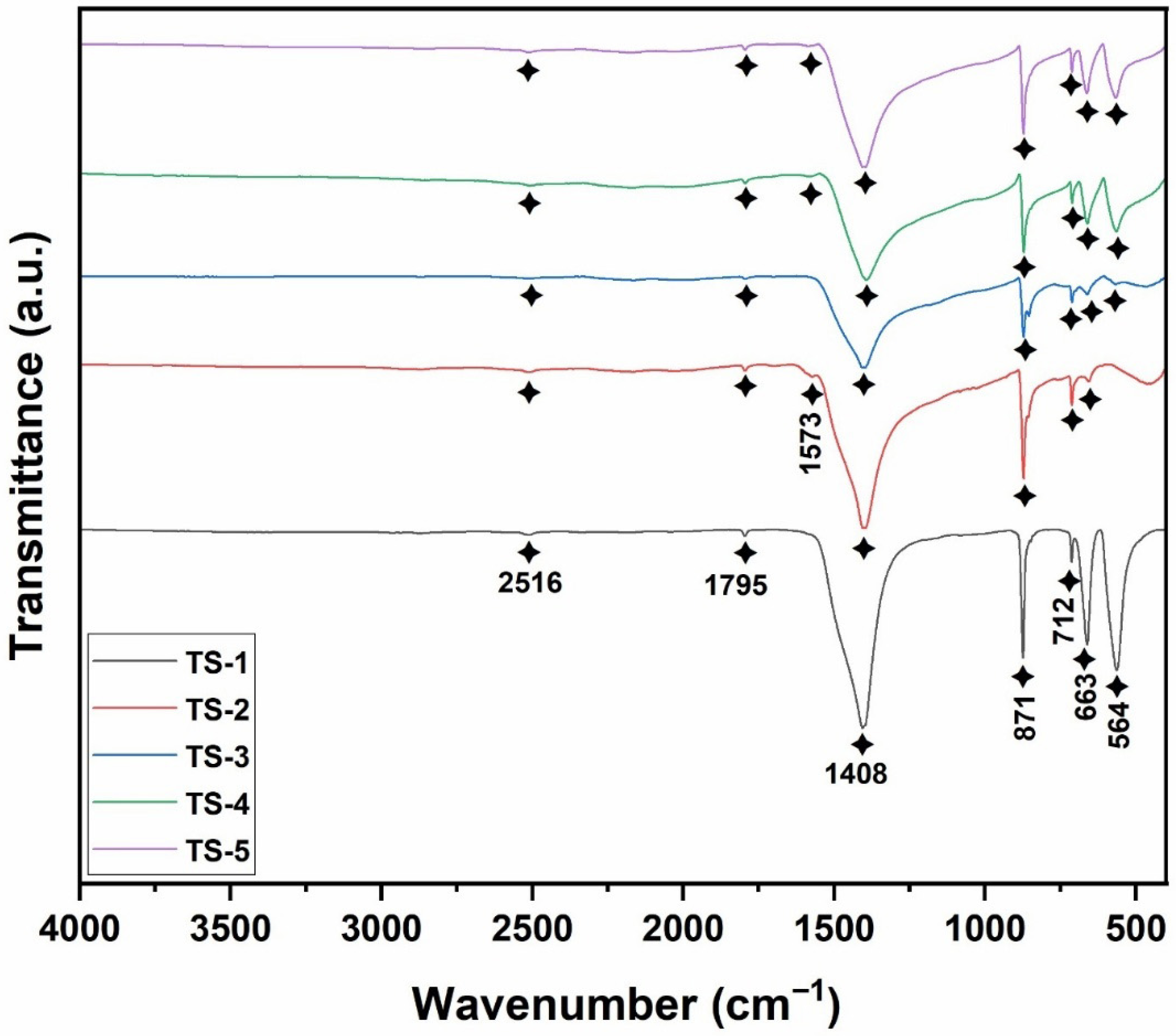 −1 was detected only in TS-1 and TS-3. In TS-2–TS-5, additional bands emerged at ~1300 and ~1580 cm