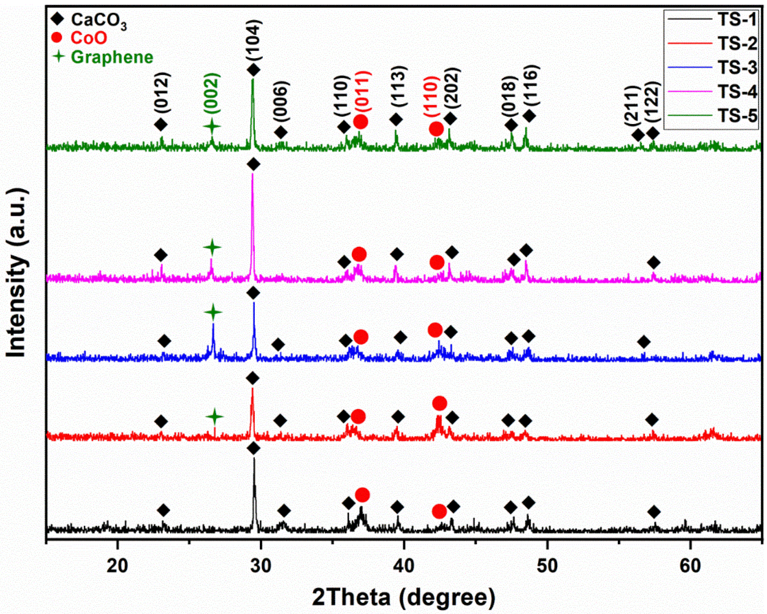 3–CoO phase assemblage was preserved. A (002) graphene reflection appeared near 2θ ≈ 26.50° in graphene-containing samples TS-2 through TS-5 [