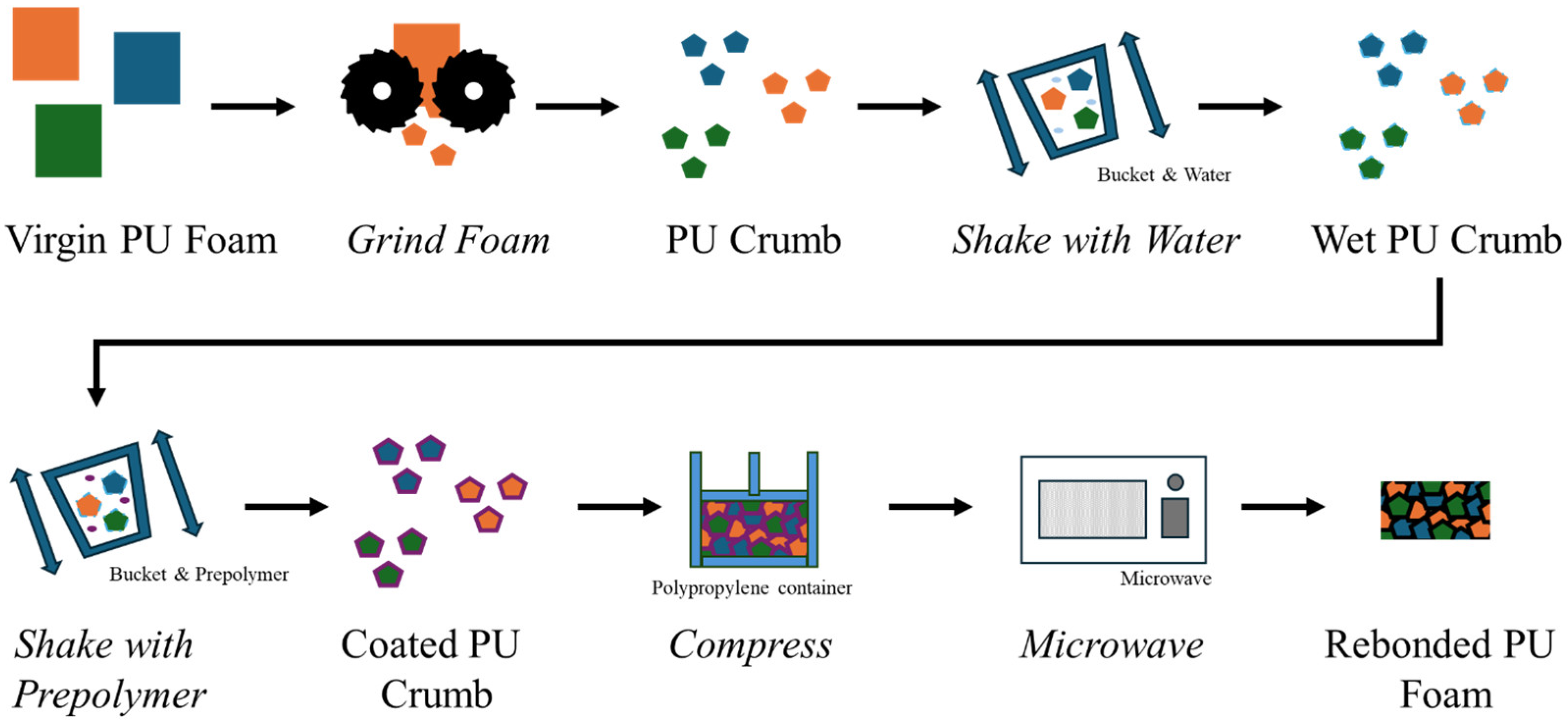 PUF crumb was obtained from industrial sources but can be generated locally through the comminution (grinding/crushing/cutting) of virgin PUFs. The laboratory-scale rebonding process is shown in