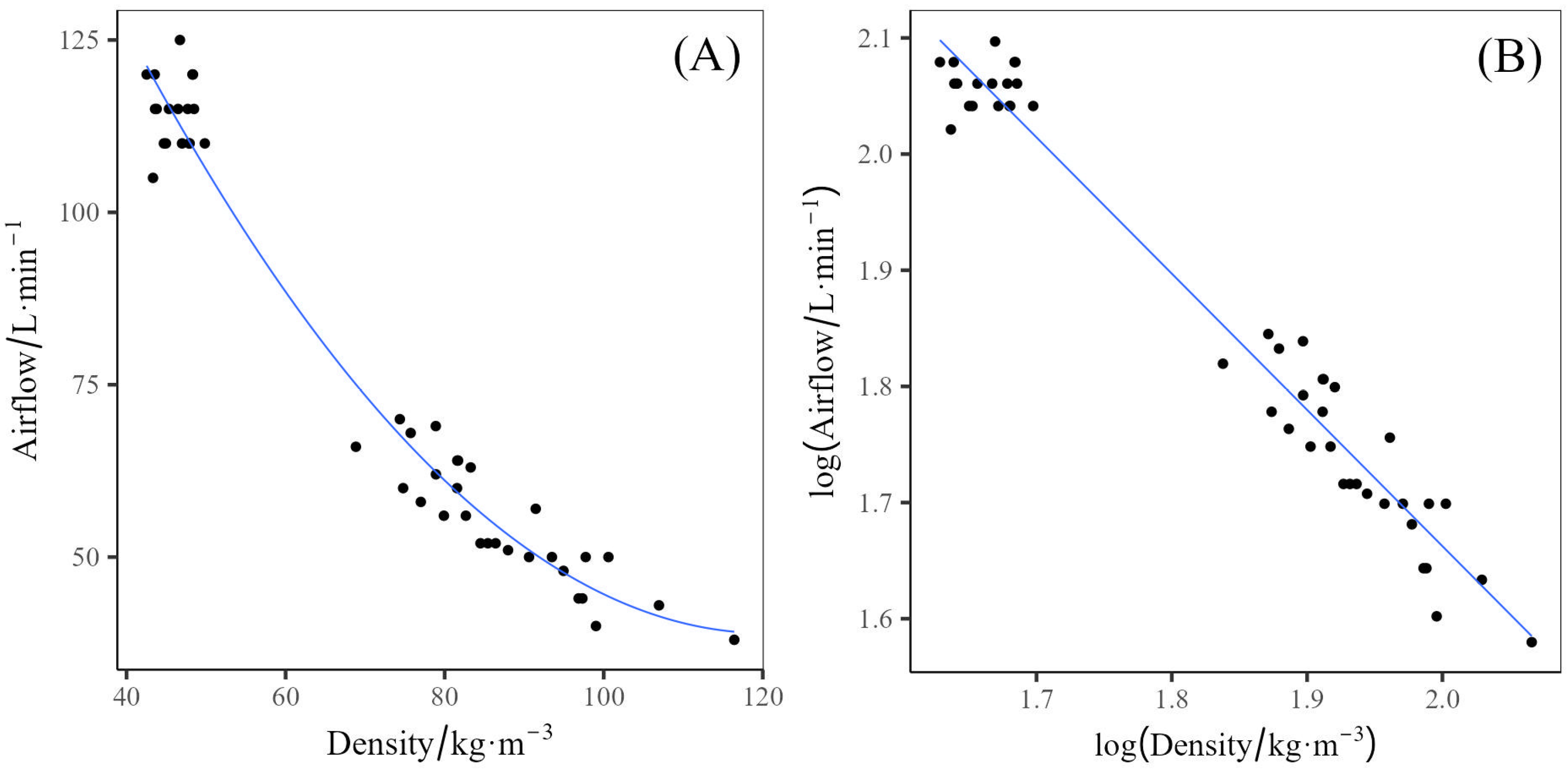 −1 of airflow, and the high density (120 g) achieving 38–64 L·min