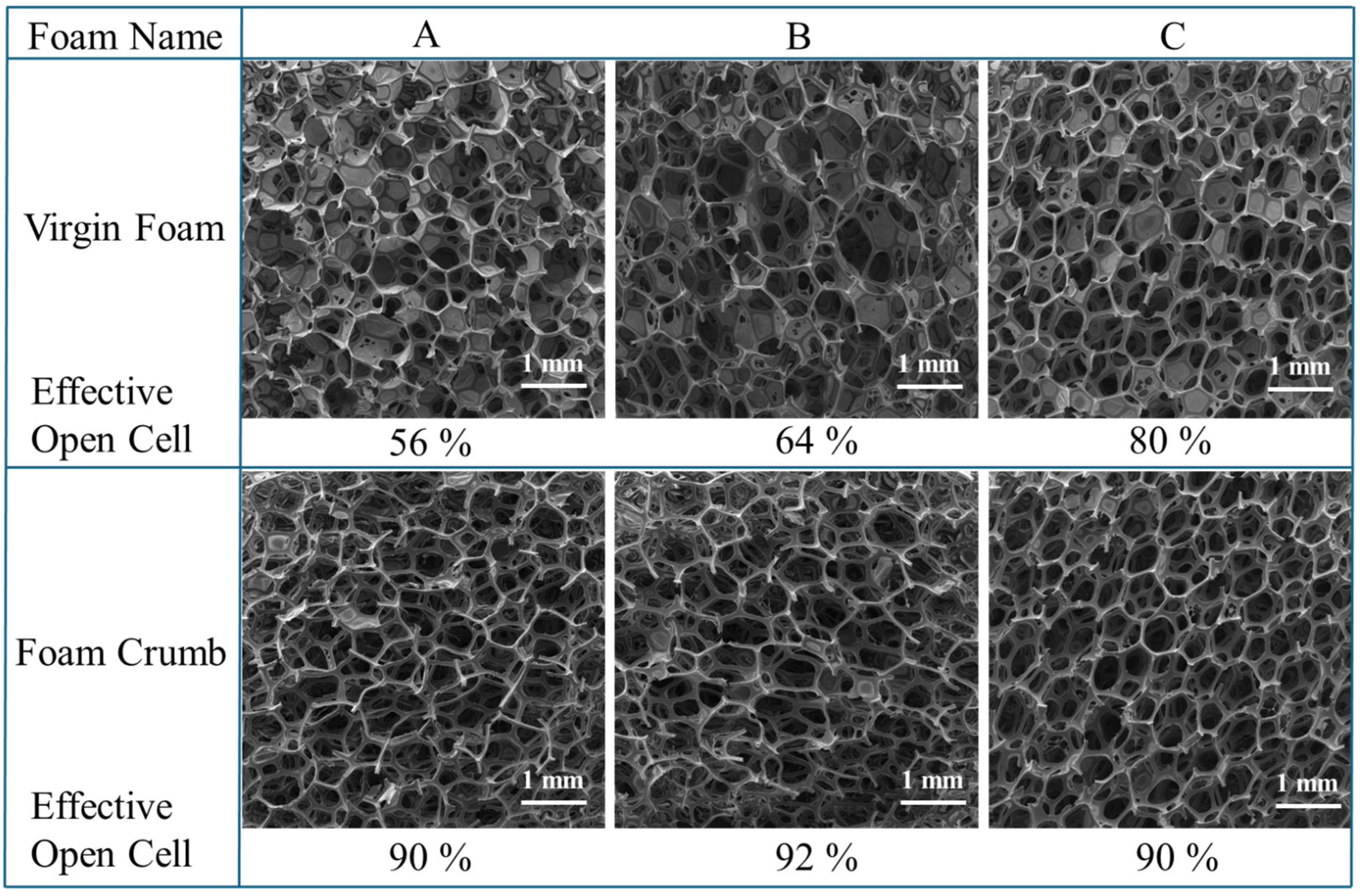 Additionally, the comminution process employed to produce foam crumb significantly increases the number of open cells in a foam.
