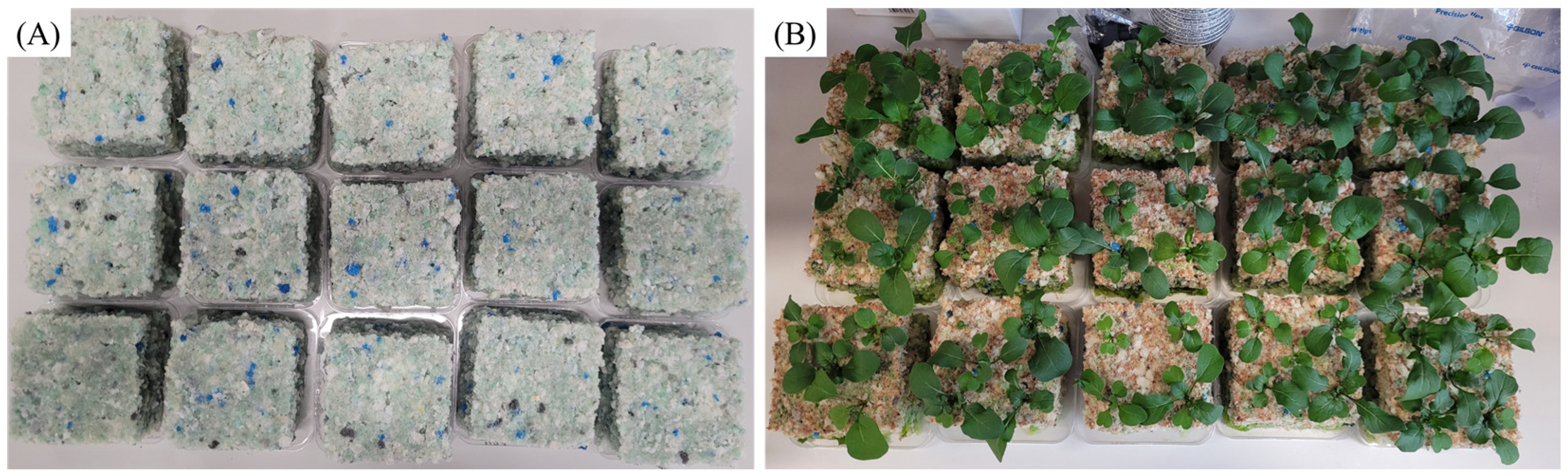Mineral wool was used as a control, with 9 mineral wool starter plugs (25 mm × 25 mm × 40 mm) placed in a square petri dish (100 mm × 100 mm× 10 mm), and one seed was placed in each plug. Five replicates of mineral wool were used for a total of 45 plants.