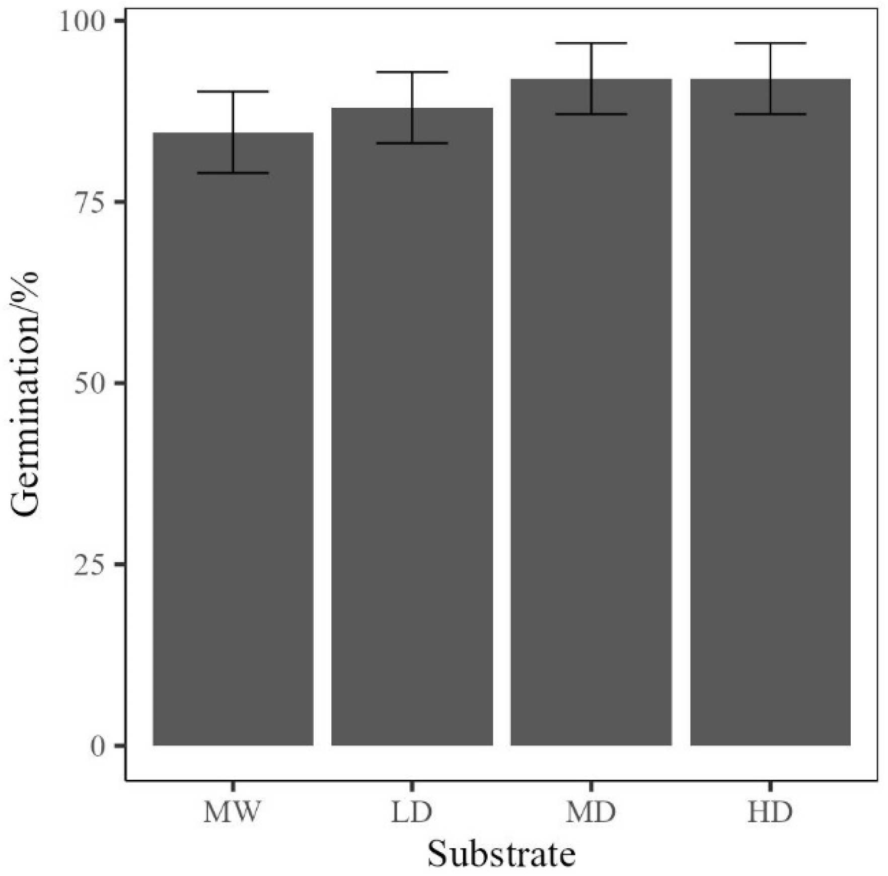 Figure 10), with the medium- and high-density rebonds having an average of over 90%. This primarily indicates that the use of rebonds is viable for the germination of plants, where multiple densities can be utilised without a reduction in germination rates below mineral wool (ANOVA; F [3,4] = 1.8127,