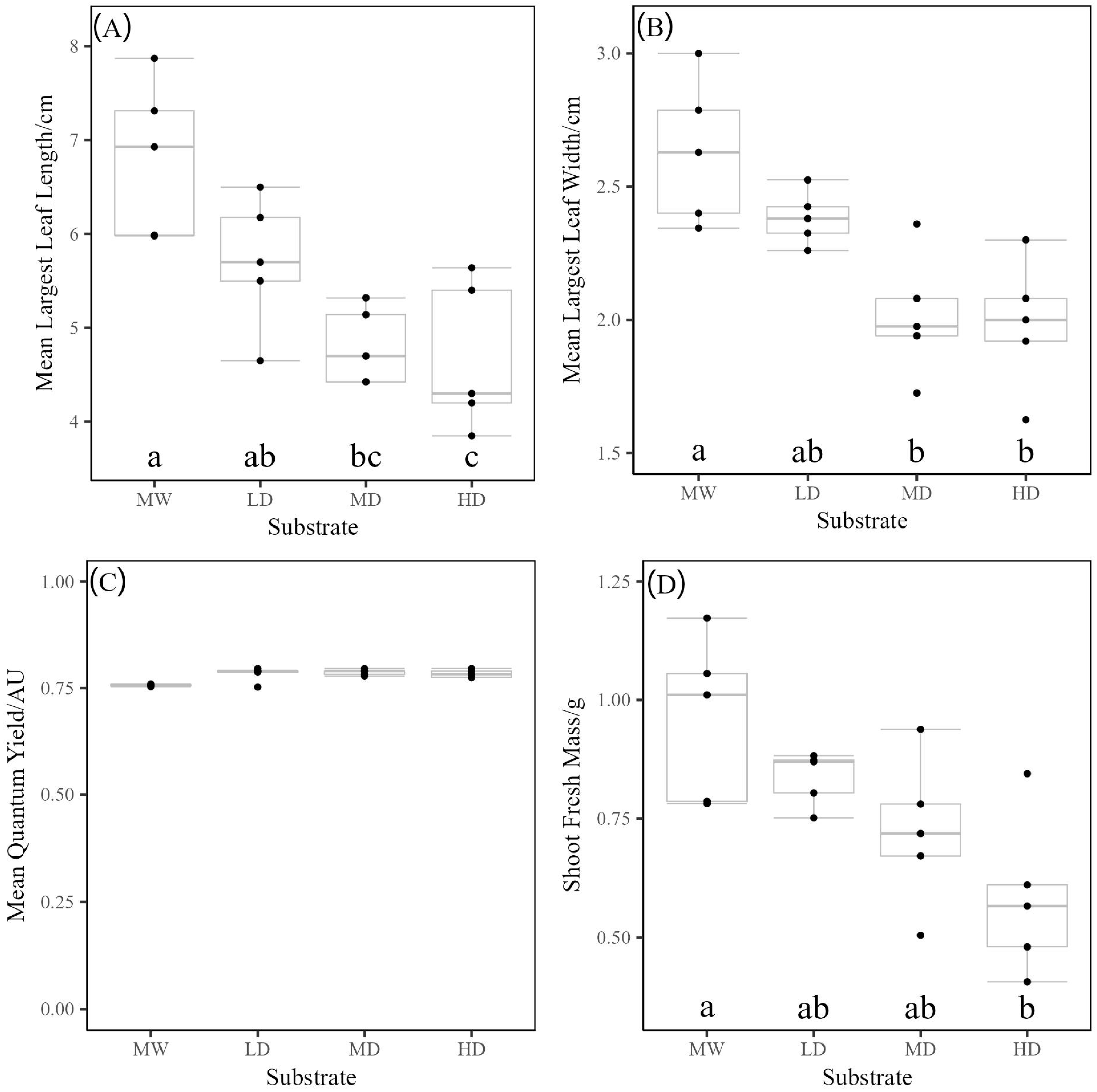 After three weeks of growth, rucola plants were measured for their largest leaf width, length, and quantum yield as indicators of plant health and yield. Finally, the total shoot fresh mass of each plant was also measured.