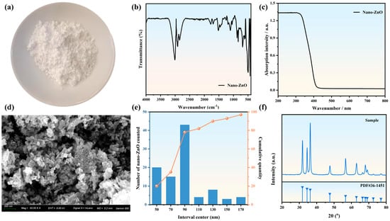 Nano-ZnO in the form of white powder (as shown in Figure 1a) was obtained from Qinghe Ruineng New Materials Co., LTD., Xingtai, China. Its infrared spectrum and ultraviolet visible spectrum are shown in Figure 1b,c. The infrared spectrum test results for nano-zinc oxide show that it has obvious zinc oxide characteristic peaks at 3150 cm−1 to 2950 cm−1 and 443 cm−1, and the nano-ZnO powder is highly absorbed in the wavelength range of 200 nm to 350 nm [21,22], as shown in Figure 1c. The microstructure of nano-zinc oxide is illustrated in Figure 1d, while Figure 1e displays its particle size distribution. The ZnO sample exhibits a particle size distribution with D50 and D90 of 95 nm and 135 nm, respectively, and a specific surface area of 110 m2·g−1. The XRD results of nano-ZnO are shown in Figure 1f, which shows that diffraction peaks of certain intensities occur at 31.81°, 34.49°, 36.28°, 47.58°, 56.63°, 62.91°, 66.44°, 67.96°, and 69.14°, and it has the crystal structure of Zincite [23].