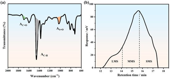 FTIR was performed using a Varian 600-IR infrared spectrometer (Agilent, Palo Alto, CA, USA). The binders, after being subjected to various aging conditions, were analyzed within the spectral range of 4000 cm−1 to 600 cm−1, using a resolution setting of 0.5 cm−1 and performing 32 scans. For all the original infrared spectral data, the automatic baseline correction function of OMNIC 9.2 software was used to ensure that the spectral baseline was straight, and at the same time, we eliminated the influence of the background and scattering. To quantitatively analyze the content of carbonyl and sulfoxide groups, the absorption peaks near 1700 cm−1 and 1030 cm−1 were fitted by peak separation. The peak position, peak height, and half-height width were adjusted using the multi-peak fitting tool in Origin to minimize the fitting residuals, thereby obtaining relatively accurate data. The carbonyl index (IC=O) and sulfoxide index (IS=O) (as shown in Figure 2a) characterize the degree of asphalt oxidation during aging, as shown in Equations (2) and (3):
