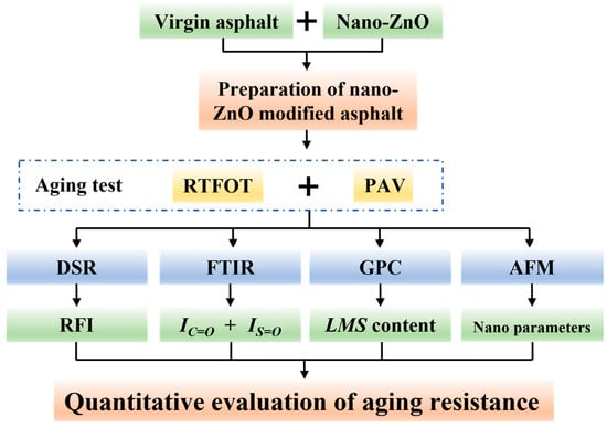 The nanomorphologies of the different asphalt samples were tested by Bruker Dimension icon AFM (Billerica, MA, USA). The scanning frequency in the AFM test was 1 Hz, and the surface morphologies of the asphalt matrix and the asphalt modified with 3% nano-ZnO were scanned in tapping mode. In addition, NanoScope Analysis 1.5 was used to perform a statistical analysis on the bee structure of each asphalt sample, with the parameters including image height difference, roughness, average aspect ratio of the bee structure, average area, and others (no fewer than 20 bee structures were counted for each sample) [29]. The testing process employed in this study is shown in Figure 3.