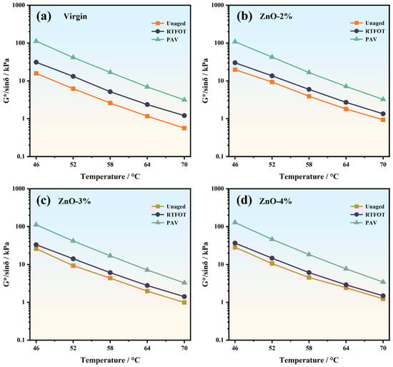 By analyzing the G* and δ variations in asphalt, the rutting factor (G*/sinδ) of asphalt under various conditions was determined, as illustrated in Figure 4. G*/sinδ combines the two viscoelastic parameters G* and δ, which reflects the resistance of asphalt to permanent deformation. A larger rutting factor value indicates that the asphalt is more resistant to rutting deformation. The rutting factor of all asphalt is negatively correlated with the test temperature; that is, G*/sinδ is relatively low under higher-temperature conditions. This indicates that at high temperatures, the capacity of asphalt to resist permanent deformation progressively diminishes. The rutting factor of nano-ZnO-modified asphalt is higher under unaged experimental conditions; taking the middle temperature (58 °C) as an example, the G*/sinδ values of ZnO-2%, ZnO-3%, and Zn-O-4% are 3.92 kPa, 4.36 kPa, and 4.51 kPa, respectively, and compared with the rutting factors value of 2.60 kPa in the virgin state, that of the three ZnO-modified asphalt samples increased by 50.70%, 67.57%, and 73.41%, respectively.