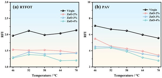 The short-term aging rutting factor index for the four types of asphalt at various temperatures is presented in Figure 5a. The RFI value of the virgin asphalt is maintained at around 2.0, and this type of asphalt is less affected by temperature, while the RFI values of ZnO-modified asphalt are all lower than 1.6. The RFI value of ZnO-2% is around 1.5, and decreases slightly at higher temperatures. The RFI values of ZnO-3% and ZnO-4% first increase and then decrease with increasing temperature. Taking the temperature of 58 °C as an example, the RFI values of ZnO-2%, ZnO-3%, and Zn-O-4% are reduced by 23.41%, 29.66%, and 31.84%, respectively, compared with the virgin asphalt. The ZnO content is inversely proportional to the RFI value, that is, the asphalt sample with a larger ZnO content has a lower RFI value. The rutting factor indices of the four types of asphalt at different temperatures after PAV are shown in Figure 5b. Unlike in the RTFOT state, there is an obvious relationship between the RFI values of the four asphalt types after PAV and temperature. The RFI value gradually decreases with increasing test temperature, especially at temperatures between 52 °C and 70 °C. That is, under higher-temperature conditions, the RFI values of the four types of asphalt are relatively low. The RFI value of the virgin asphalt after PAV is maintained between 5.5 and 7.1, while the RFI value of the asphalt mixed with ZnO is between 2.7 and 5.5. Taking the temperature of 58 °C as an example, the RFI values of ZnO-2%, ZnO-3%, and Zn-O-4% are reduced by 34.32%, 37.36%, and 39.75%, respectively, compared with virgin asphalt. These results show that ZnO content is closely related to changes in the RFI, and the RFI of the asphalt sample containing ZnO after PAV is more significantly reduced.