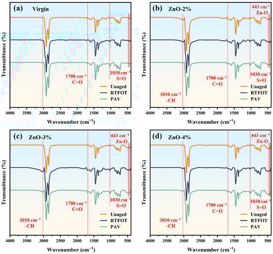 The FTIR spectra of the three types of nano-ZnO-modified asphalt are shown in Figure 6b–d. In addition to the characteristic peaks in the infrared spectrum of the virgin asphalt, the nano-ZnO-modified asphalt presents -CH vibration absorption peaks at 3010 cm−1, as well as the characteristic peak of Zn-O at 443 cm−1. Figure 1b shows that these two absorption peaks are the characteristic peaks of the nano-ZnO raw material. No new absorption peaks were found except the characteristic peaks of the virgin asphalt and the nano-ZnO raw material. Therefore, there was a physical modification effect between nano-ZnO and asphalt, and no new chemical reactions occurred between them. It is worth noting that during aging, the characteristic peak intensity of the three types of nano-ZnO-modified asphalt at 1700 cm−1 and 1030 cm−1 gradually increased. The UV scattering ability of ZnO can reduce photochemical oxidation, while ZnO scavenges free radicals through oxygen vacancy sites to enhance the aging resistance of asphalt [33,34]. However, it is difficult to distinguish the specific differences in the four types of asphalt upon being subjected to various aging conditions from the infrared spectra alone.