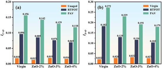 As shown in Figure 7, the IC=O values of the four types of asphalt (virgin, ZnO-2%, ZnO-3% and ZnO-4%) in the unaged state are between 0.013 and 0.019, and their numerical changes have no obvious relationship with the ZnO content. The IC=O values increase by 0.078, 0.072, 0.057, and 0.053, respectively, under short-term aging via RTFOT, and by 0.138, 0.129, 0.110, and 0.102, respectively, under aging via PAV. We found that the IC=O value of virgin asphalt increases most significantly (that is, virgin asphalt has the worst aging resistance), while that of nano-ZnO-modified asphalt increases relatively slowly after aging, especially via PAV; however, the IC=O values of the four types of asphalt after PAV differ by less than 0.04, and the overall difference is not obvious.