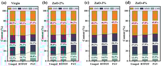 The ratios of molecular sizes for the four types of asphalt under the three aging conditions are presented in Figure 8. During aging, the medium and small molecules are oxidized and polymerized, and their size gradually increases. Specifically, the asphalt’s LMS ratio gradually increases, with that of the virgin asphalt after RTFOT and PAV increasing to 14.7% and 18.8%, respectively, 2.4% and 6.5% higher than in the unaged state. The initial LMSs of the three types of nano-ZnO-modified asphalt are larger (13.1%, 13.5%, and 13.4%, respectively) than that of the virgin asphalt (12.3%). However, the increment in the LMS ratios of the three types of nano-ZnO-modified asphalt after aging is relatively low. After RTFOT, their LMS ratios are between 14.3% and 14.5%, and after PAV, they are 17.6%, 16.5%, and 15.9%, respectively. The above results indicate that the LMS of nano-ZnO-modified asphalt after PAV is lower than that of virgin asphalt, and the LMS growth of asphalt with a larger ZnO content is smaller. Therefore, from the perspective of changes in the proportions of molecular sizes, the addition of nano-ZnO can improve the anti-aging performance of asphalt.