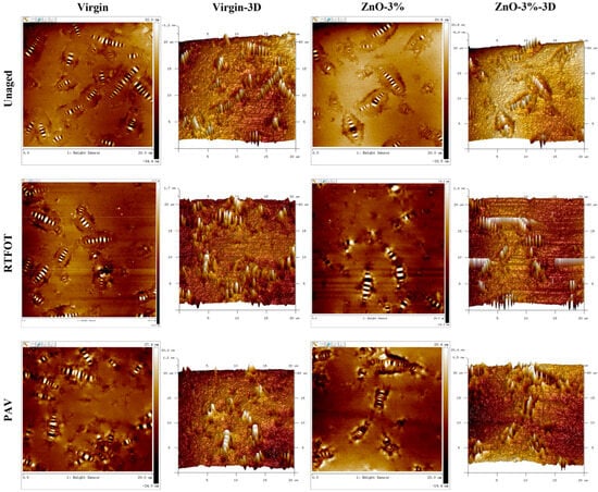 The ZnO-3% sample was compared with the virgin sample, and their nanomorphologies upon being subjected to various aging conditions are shown in Figure 9. A bee structure with alternating “light and dark” can be seen in both asphalt samples. The 3D morphology better reflects the height relationship between the “light and dark” phases of the asphalt bee structure, where the “light” phase is the peak, and the “dark” phase is the trough. A black dot-like substance can be found in the two-dimensional nanomorphology of ZnO-2%, which is related to the incorporation of nano-ZnO. In the unaged state, the bee structure in virgin asphalt is relatively slender, that is, the aspect ratio is relatively large. The bee structures in ZnO-3% are of different sizes, and there are fewer of them than in the virgin asphalt. After RTFOT, the nanomorphologies of the two types of asphalt are more regular than those in the unaged state (according to the 3D image), and the quantity of bee structures is slightly decreased. The nanomorphologies of the two types of asphalt after PAV are similar to those in the RTFOT state, and the morphology diagram shows no obvious difference between the asphalt samples in the two aging states.