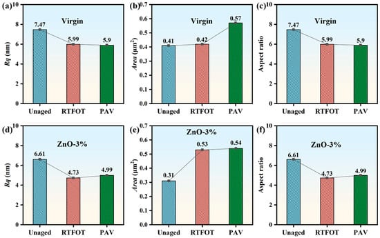 (a–f) Changes in nano-parameters of asphalt (virgin and ZnO-3%) under different aging conditions (unaged, RTFOT, and PAV).