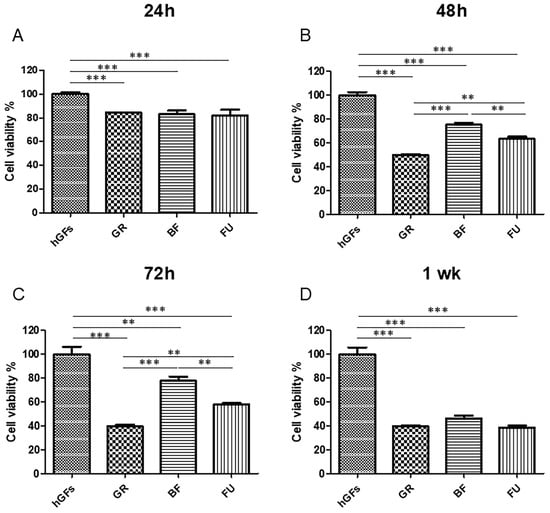 Metabolic activity of the cells. Effect of GR, BF, and FU on hGFs after 24 h, 48 h, 72 h, and 1 week of treatment. (A) Cell viability analysed at 24h of culture. (B) Cell viability analysed at 48h of culture. (C) Cell viability analysed at 72h of culture. (D) Cell viability analysed after 1 week of culture. Results are shown as mean ± standard error (SEM) (n ≥ 3) of the optical percentage (%) of metabolically active cells (** p < 0.01, *** p < 0.001).