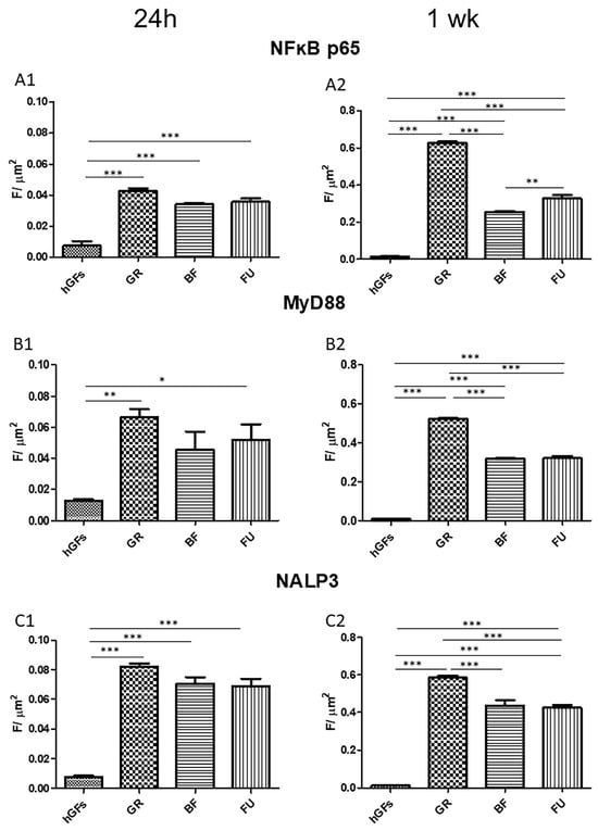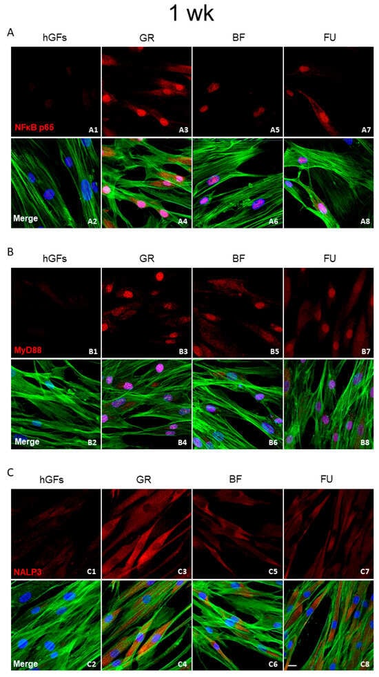 The immunofluorescence revealed that in the hGFs culture, the pro-inflammatory markers levels NFkB p65, MyD88, and NALP3 were upregulated after exposure to GR, BF, and FU eluates (Figure 2, Figure 3 and Figure 4). In particular, the level of inflammatory proteins was significantly upregulated after 1-week exposure. The inflammation pathway was more upregulated following the GR eluate exposure compared to the BF and FU eluates (Figure 3 and Figure 4).