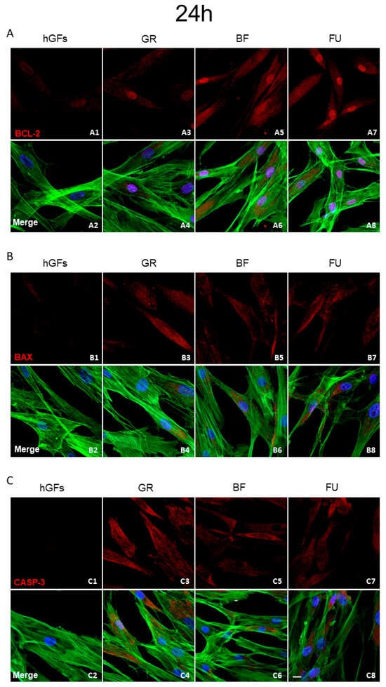 Expression of apoptotic markers after 24 h of treatment. (A) Immunofluorescence detection of BCL-2, red channel, in the CTRL group (A1) and after 24 h of exposure to GR (A3), BF (A5), and FU (A7); merge image of all channels in the CTRL group (A2) and after 24 h of exposure to GR (A4), BF (A6), and FU (A8). (B) Immunofluorescence detection of BAX, red channel, in the CTRL group (B1) and after 24 h of exposure to GR (B3), BF (B5), and FU (B7); merge image of all channels in the CTRL group (B2) and after 24 h of exposure to GR (B4), BF (B6), and FU (B8). (C) Immunofluorescence detection of CASP-3, red channel, in the CTRL group (C1) and after 24 h of exposure to GR (C3), BF (C5), and FU (C7); merge image of all channels in the CTRL group (C2) and after 24 h of exposure to GR (C4), BF (C6), and FU (C8). Mag: 40×. Scale bar: 10 µm.