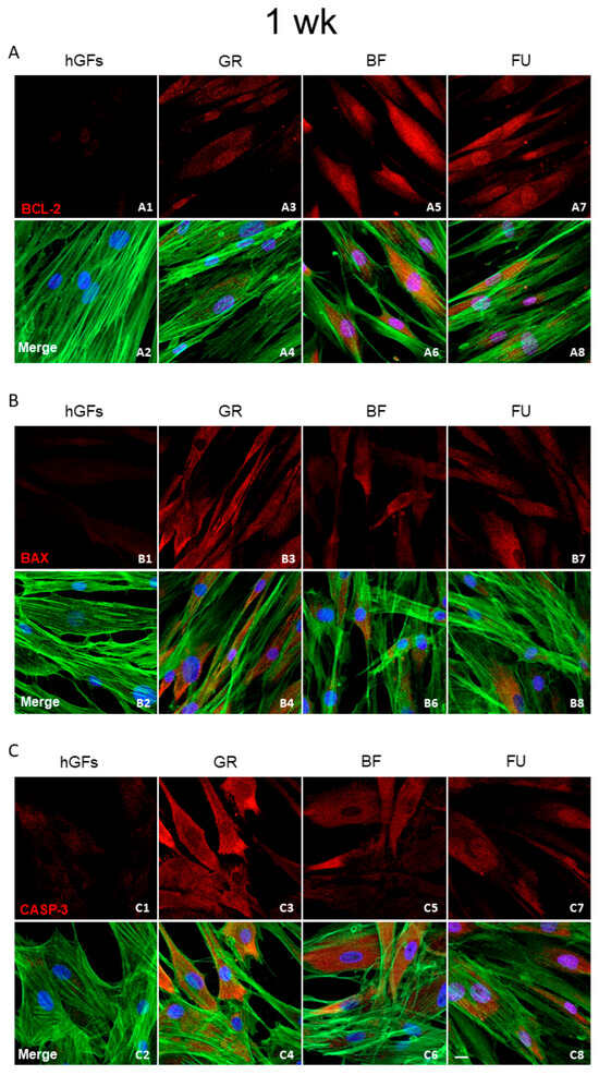 Regarding the apoptosis pathway BCL-2/BAX/CASP-3, a reduction in the BCL-2 immunofluorescence levels was detected in hGFs exposed to dental composites for 24 h and 1 week. hGFs exposed to GR showed a more pronounced BCL-2-expression decrease compared to the control group and to the BF- and FU-exposed cells. However, BAX and CASP-3 levels increased after exposure to all composite eluates (GR, BF, and FU).