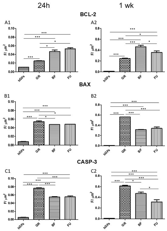 The level of BCL-2 immunofluorescence was decreased in hGFs exposed to all composite eluates both for 24 h and 1 week (Figure 5A and Figure 6A). Specifically, BCL-2 expression decreased in hGFs exposed to GR when compared to untreated cells (CTRL) and to BF and FU exposure (Figure 7A1,A2). On the other hand, the levels of BAX and CASP-3 increased after dental composites exposure (GR, BF, and FU) (Figure 5B,C and Figure 6B,C). Quantitative data for BAX and CASP-3 expression showed increased levels after 1-week exposure to BF and FU eluates (Figure 7B1,B2,C1,C2).