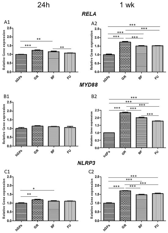 RELA, MYD88, and NLRP3 gene expression. (A1,B1,C1) Histograms of real-time PCR for RELA-, MYD88-, and NLRP3-related gene expression in untreated cells (CTRL) and GR, BF, and FU samples after 24 h of exposure. (A2,B2,C2) Histograms of real-time PCR for RELA-, MYD88-, and NLRP3-related gene expression in untreated cells (CTRL) and GR, BF, and FU samples after 1 week of exposure. * p < 0.05; ** p < 0.01; *** p < 0.001.