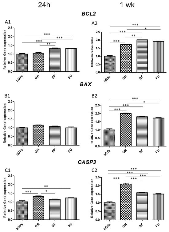 BCL2, BAX, and CASP3 gene expression. (A1,B1,C1) Histograms of real-time PCR for BCL2-, BAX- and CASP3-related gene expression in untreated cells (CTRL) and GR, BF, and FU samples after 24 h of exposure. (A2,B2,C2) Histograms of real-time PCR BCL2-, BAX- and CASP3-related gene expression in untreated cells (CTRL), and GR, BF, and FU samples after 1 week of exposure. * p < 0.05; ** p < 0.01; *** p < 0.001.