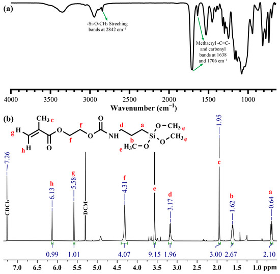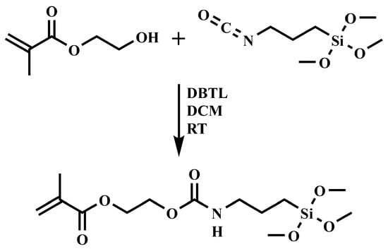 3,3-Dimethoxy-8-oxo-2,9-dioxa-7-aza-3-silaundecan-11-yl methacrylate (SHEMA) was synthesized through a urethane formation reaction catalyzed by dibutyltin dilaurate (DBTL) from 2-hydroxyethyl methacrylate (HEMA) and (3-isocyanatopropyl) trimethoxy silane (IPTMS). The reaction (Figure 2) was carried out by mixing HEMA and IPTMS in a stoichiometric ratio in anhydrous dichloromethane (DCM) at 23 ± 2 °C for 24 h. Specifically, a 250 mL round-bottom flask equipped with a magnetic stirrer and a nitrogen purging system was charged with HEMA (10.0 g, 0.08 mol), DBTL (150 μL), and DCM (100 mL). IPTMS (15.77 g, 0.08 mol), dissolved in 50 mL of DCM, was then added dropwise over the course of 3 h. The progress of the reaction was monitored via FTIR spectroscopy (Frontier FTIR Spectrometer, Perkin-Elmer, Shelton, CT, USA), with particular attention paid to the disappearance of the isocyanate (–NCO) band at 2273 cm−1. Upon completion, the solvent DCM was removed under reduced pressure using a rotary evaporator. The final product was obtained as a colorless viscous liquid with an 87% yield. The structure of the resultant product was verified using both FTIR and 1H-NMR spectroscopy (AVIIIHD 400 MHz NMR, Bruker, Billerica, MA, USA). The 1H-NMR spectrum (CDCl3, δ ppm) showed signals at: 0.64 (2H, a), 1.62 (2H, b), 1.95 (3H, c), 3.19 (2H, d), 3.57 (9H, e), 4.31 (4H, f), and 5.59–6.14 (2H, g + h).