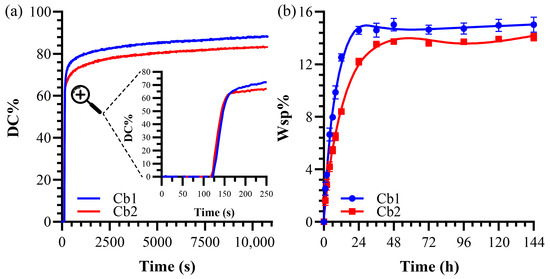 The polymerization kinetics were determined by calculating the maximum rate of conversion (RPmax), derived from the first derivative of the DC over time. The values of DC and RPmax are presented in Table 2 [46].