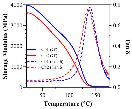 Under dry conditions: tan δ vs. temperature curves and storage modulus vs. temperature curves for Cb1 and Cb2.
