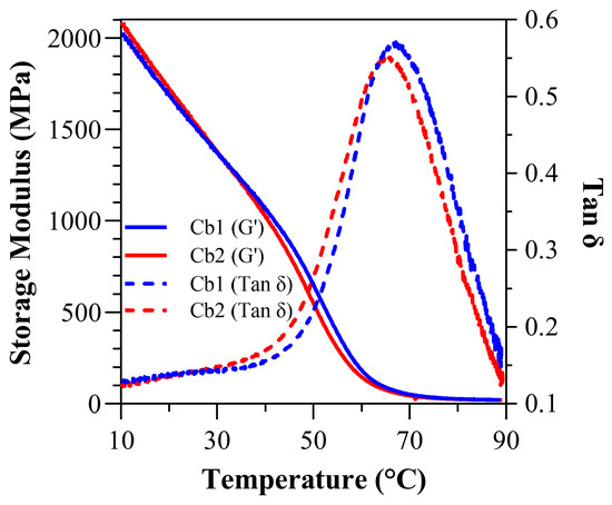 Under water-submersed conditions (Figure 6 and Table 5), at 37 °C, the storage modulus (GPa) for Cb1 was significantly greater (p < 0.05) than Cb2 at 1.16 ± 0.00 (1163.20 ± 6.50 MPa) and 1.03 ± 0.00 (1027.60 ± 40.8 MPa), respectively. At 70 °C, the wet storage modulus (GPa) dropped precipitously, and the values were comparable 0.05 ± 0.00 (51.28 ± 4.20 MPa) and 0.04 ± 0.00 (37.02 ± 8.90 MPa) GPa for Cb1 and Cb2, respectively. The wet rubbery modulus for both Cb1 and Cb2 was 0.02 ± 0.00 GPa (20.69 ± 0.40 MPa and 19.16 ± 1.10 MPa, respectively). The wet Tg was measured at 67.93 ± 0.7 °C for Cb1 and 65.55 ± 0.9 °C for Cb2 (p < 0.05). The calculated inverse ratio (ζ) under submersed conditions was 4.16 × 10−6 (Pa−1·K) for Cb1 and 4.50 × 10−6 (Pa−1·K) for Cb2. The wet FWHM was 28.98 ± 0.79 for Cb1 and 30.32 ± 0.3 for Cb2, while the wet loss factor was 0.5760 ± 0.02 for Cb1 and 0.5570 ± 0.00 for Cb2 (Table 5).