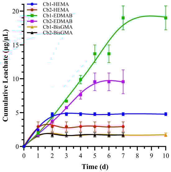 Time-dependent cumulative leachate concentrations of HEMA, BisGMA, and EDMAB from Cb1 and Cb2 formulations during ethanol incubation. Data points represent total accumulated concentration at each time interval. Note that Cb2 formulation reaches equilibrium plateau by day 7, while Cb1 continues releasing until day 10, suggesting differences in network tortuosity and diffusional resistance.