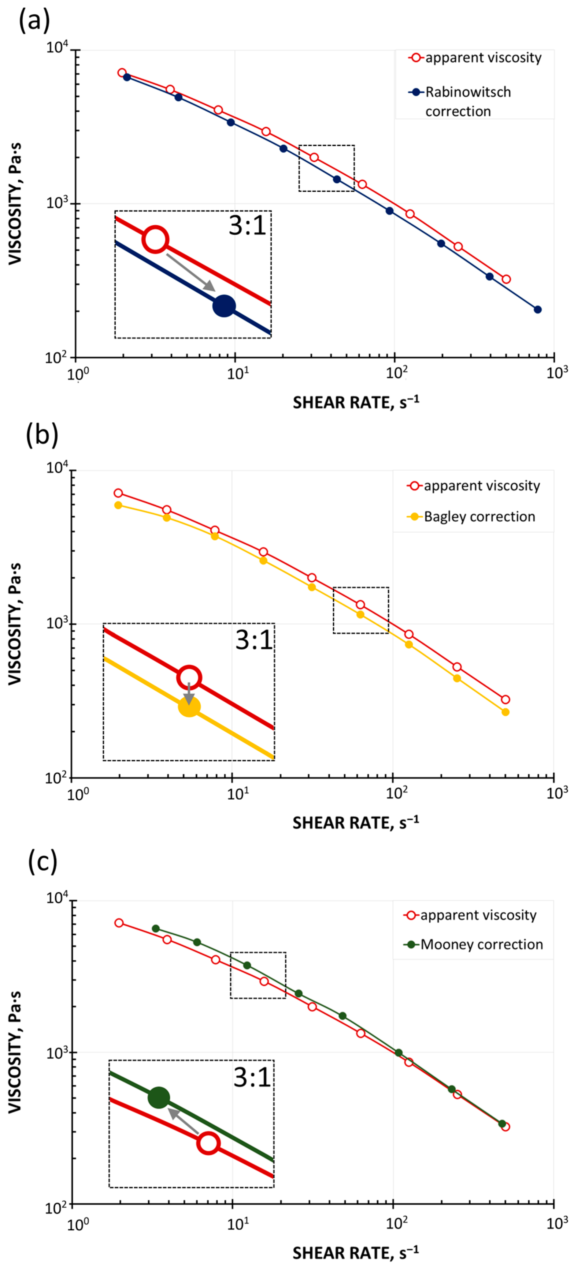 - These issues must also be taken into account when modeling polymer processing, e.g., extrusion or injection molding. Two aspects of slip effects should be considered: rheological and process flow modeling. The effect of slipping can be removed from viscosity measurements by using the Mooney correction, which results in an increase in viscosity since the shear rate decreases as the shear stress remains unchanged. This may have substantial effects on process modeling. On the other hand, considering the slip effects in process modeling results in an increase in the flow rate and pressure decrease. These issues were discussed in [74,75], and, e.g., in [76,77,78,79,80].
