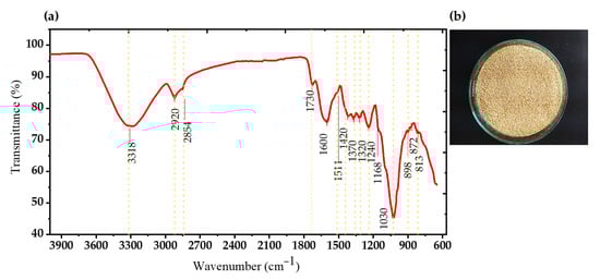 In terms of dry matter, the bracts presented an approximate composition of 27% cellulose, 8% hemicellulose, 10% lignin and 55% other compounds (mainly inulin, proteins and ash), according to Kammoun et al. [12] and the results obtained by FTIR and HPLC in this study, confirming their lignocellulosic nature and their potential as a substrate for fermentations. These were qualitatively identified through infrared spectroscopy, as shown in Figure 1. Infrared (IR) spectra around 3318 cm−1 were observed, corresponding to the stretching vibration bands of OH groups [27], Moreover, peaks at 2854, 1420, 1030 y 898 cm−1 were associated with CH stretching, CH vibration, the C-O-C pyranose ring backbone, and the presence of β-glycosidic bonds, respectively, these groups constitute the cellulose structure [28,29]. Additionally, the band around 1030–1168 cm−1 was attributed to the C–O–C stretching of glycosidic bonds [30]. The specific peak at 1030 cm−1 belongs to a C-O-C stretching band in the fructofuranose ring, and together with the bands at 872 and 813 cm−1, they are classified as β-(2→1) glycosidic bonds from the 2-keto group in fructofuranose [31], these peaks represent the presence of structural inulin, a characteristic component of artichoke [32]. The 2854 cm−1 peak corresponds to the C-H stretching vibration in the aldehyde group, which may indicate the presence of cellulose, hemicellulose, and lignin; in turn, the peak near 1511 cm−1 may be attributed to lignin vibration in the benzene ring [33]. Other identified peaks include 1420 cm−1 associated with the symmetric stretching of the carboxylate group (COO-), found in both fatty acids and amino acids. In addition, the C–N stretching of amide III groups, belonging to proteins, was linked to the band at 13,15 cm−1 [34].