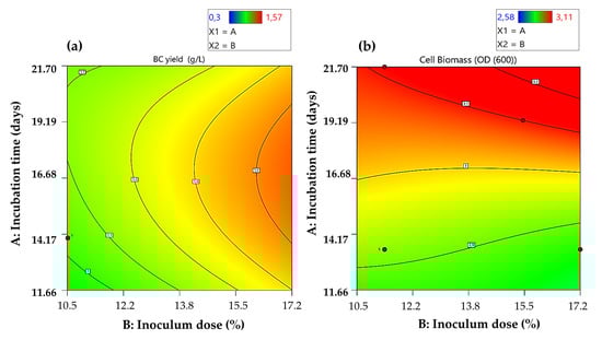 Furthermore, in Figure 4a, which corresponds to BC yield, it is evident that increasing the inoculum dose markedly enhances BC production, with a clear upward trend towards the right side of the graph, where warm colors predominate. Incubation time also influences production, although to a lesser extent, as shown by the nearly vertical contour lines. These results correlate with the analysis of variance (ANOVA), which revealed highly significant effects for both inoculum dose (p < 0.0001) and incubation time (p = 0.0003), with the former being the most determinant factor (F = 310.66). On the other hand, Figure 4b, which represents cell biomass, shows a different pattern where biomass increases with incubation time, while inoculum dose exerts little effect. This behavior aligns with the ANOVA results, where only incubation time was statistically significant (p = 0.0094), in contrast to inoculum dose and interaction, which were not. Similarly, the optimization of BC yield and cell biomass showed a fourth-degree polynomial model behavior between the factors and coefficients for a significant model (Equations (4) and (5)).