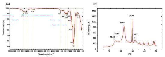 Figure 5 presents the structural analysis of BC produced by Komagataeibacter rhaeticus QK23 from AWAB hydrolysates, using FTIR and XRD. The FTIR spectrum (Figure 5a) revealed bands around 3344 cm−1 and 3232 cm−1 corresponding to the vibrational stretching of hydroxyl (–OH) groups, indicating a strong presence of intra- and intermolecular hydrogen bonding, characteristic of the cellulose structure [50]. The band at 2916 cm−1 is associated with C–H stretching of the methylene groups in the glucose ring [51], while the peak at 1636 cm−1 relates to the deformation vibration of water absorbed in the polymer structure [52]. The bands observed at 1421, 1366 and 1320 cm−1 are indicative of deformation vibrations of C–H and C–O–H bonds, reflecting the glucose structural composition [53]. In turn, the bands at 1159, 1110 and 1048 cm−1, are attributed to the C–O–C stretching vibrations of the glucopyranose ring, and the band at 897 cm−1, is characteristic of the β-glycosidic mode (1 → 4) linkage between glucose units, a specific marker of cellulose [54].