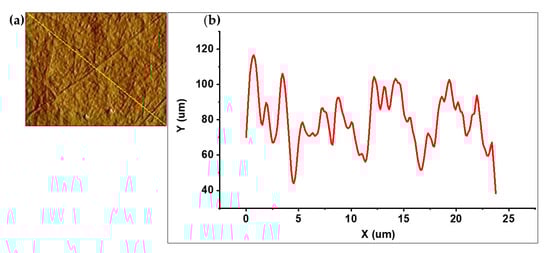 Figure 6 presents the surface topography characterization of the BC obtained from AWAB hydrolysates using AFM. Figure 6a revealed a surface composed of a randomly oriented interwoven network of microfibrils, with elevated areas and depressions indicating surface morphology heterogeneity. The yellow line traced on the image corresponds to the textural profile represented in the graph (Figure 6b), which shows surface height variations over a distance of approximately 25 µm, where the width of the BC fibers derived from AWH was estimated around 94.77 ± 8.78 nm, being this higher than the range reported by Guhados et al. [62], who reported a fiber diameter range of 27–88 nm of BC from a fructose medium using A. xylinum BPR 2001 at pH 5.0 and 28 °C, in a similar manner, Revin et al. [63], reported the average thickness of BC fibrils, measured by AFM, produced in both standard HS and molasses media, ranging from 50 to 90 nm, using Komagataeibacter sucrofermentans H-110 under static cultivation at 28 °C for 5 days. The surface roughness, expressed as the RMS value (Rq), was 32.96 nm for the BC derived from AWAB. This parameter, which corresponds to the quadratic mean of height deviations from the average plane, serves as a key indicator of the film’s microstructure [64]. These results compare with those reported by Lopes et al. [65], who described a BC with a smooth surface morphology and a roughness of 21.6 nm from the Hestrin–Schramm medium using G. xylinum in static fermentation at 28 °C for 10 days; similarly, it coincides with the results of Quiñones-Cerna et al. [19], who characterized an Rq of 27.05 for BC produced from the fermentation of asparagus waste hydrolysates using Komagataeibacter rhaeticus. Therefore, these results suggest that the BC produced from artichoke hydrolysates possesses a suitable surface morphology for functional applications, without compromising its structural integrity, as corroborated by the preceding crystallinity and molecular structure analyses.