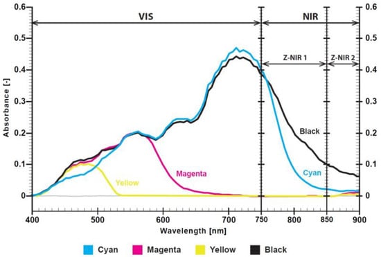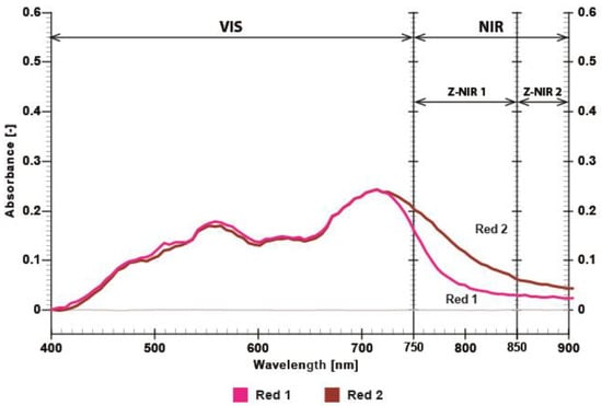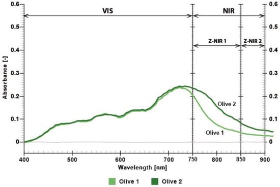 Figure 9 shows that the absorption values of blue dyes in the visible range are identical up to 750 nm, indicating that these dyes cannot be distinguished in the visible part of the spectrum. Figure 10 shows that the olive dyes (Olive 1—CMYK value: 34, 36, 100, 15 and Olive 2—CMYK value 3, 3, 100, 40) are almost identical in the visible range up to 720 nm and exhibit an absorbance difference of approximately 0.04 A.U. at 850 nm.