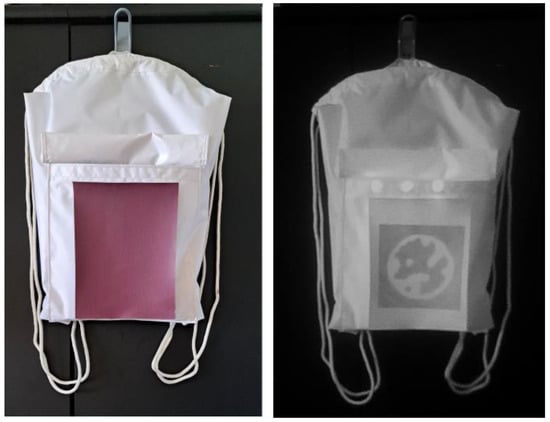 The prototype bag was fabricated from Guandong Texon Backlit (190 g/m2) white backlit material (Guandong S.p.A., Milano, Italy). Texon Backlit consists of 100% linear monoaxial polyester fibers with a vinyl emulsion and is classified as flame-retardant according to DIN 4102-B2 [17]. The material is used commercially for tents, sunshades, inflatable structures, and exhibition light boxes. For marking, the bag includes a sewn-in pocket that houses a light-emitting module, and a sheet carrying the printed STag marker is applied on top.
