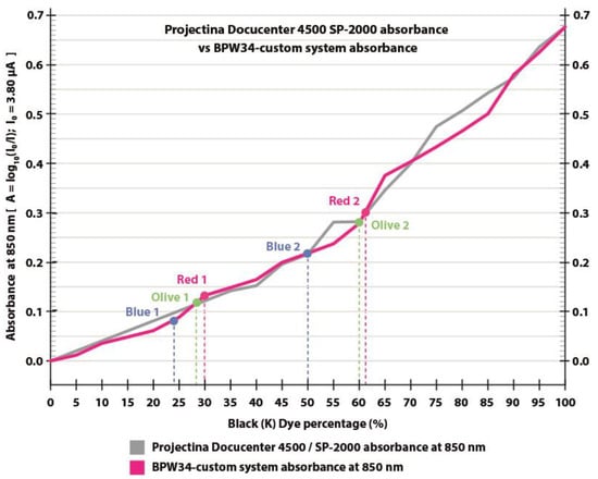 The BPW83 photodiode setup with a 750–1050 nm bandpass filter confirmed the absorbance trend, showing close agreement with the Projectina Docucenter 4500 SP-2000 spectroscopy at 850 nm under constant IR LED illumination (Figure 11). Measurements were performed on printed patches of AZON black dye from 0% (white) to 100% (black) in 5% increments.