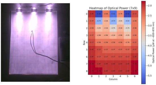 The total internal reflection (TIR) illumination system was evaluated to determine the spatial uniformity of NIR irradiance across the 15 × 20 cm plexiglass light guide. Illumination intensity was mapped using the BPW83 photodiode at 850 nm over a 7 × 9 grid (63 measurement points), with each value recorded under a constant LED drive current (18.1 mA, 4.5 V). The measured photocurrent ranged from 0.9 µA to 3.0 µA, corresponding to an optical power between 1.8 µW and 5.9 µW, assuming a responsivity of 0.507 A/W at 870 nm. Across the entire illuminated area, the relative deviation from the mean intensity was approximately +120%/−34%, with the central region remaining within ±10% of the mean value. The highest intensities were observed near the upper section of the grid, while the peripheral areas exhibited lower reflected power (Figure 13).
