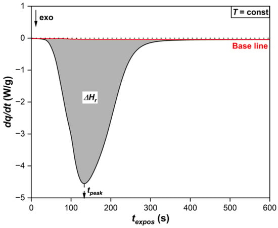 The experimental value of the heat of reaction of photochemical polymerization is calculated by finding the corresponding enthalpy of reaction, equal to the area under the Photo-DSC curve (gray shaded area) relative to the baseline (red curve), as shown in Figure 2 [6,7,33]: