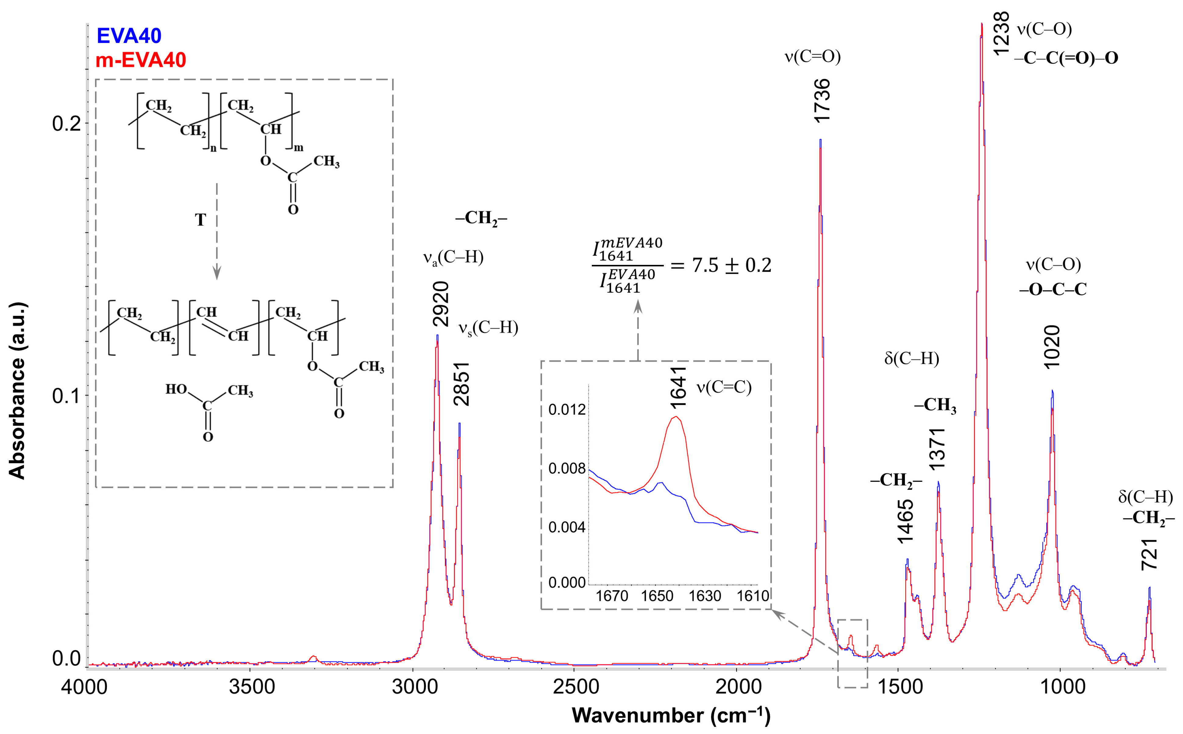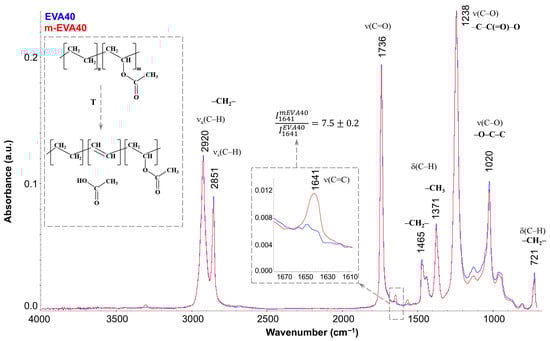 Figure 3 shows the FTIR spectra of EVA40 (blue spectrum) and m-EVA40 (red spectrum). It is seen that they have a standard appearance for the IR spectra of EVAs [34,35] and are characterized by the presence of the main absorption bands associated with the C–H stretching vibrations in the region of 3000–2800 cm−1, stretching vibrations of the carbonyl group C=O at 1736 cm−1, and the stretching vibrations of C–O in the –C–C(=O)–O and –O–C–C groups (1238 and 1020 cm−1, respectively), as well as with the deformation vibrations of these groups. The only difference between the spectra of EVA40 and m-EVA40 is the presence of a noticeable low-intensity peak at 1641 cm−1 in the latter (separately enlarged in the inset of Figure 3). Quantitative analysis showed that the intensity of this peak increases more than sevenfold for m-EVA40. The presence of absorption peaks in this region has been recorded for EVAs before [13,36], and their intensity increases noticeably with increasing VA content in EVA. Opinions are divided regarding the nature of this peak. Some authors [36] stated that there is a redistribution of the electron cloud in the VA group and the formation of stable hydrogen bonds between the oxygen of the carbonyl group and the hydrogen of the –CH2– group in the main hydrocarbon chain. Indeed, absorption peaks associated with deformation vibrations of hydroxyl groups and hydrogen bonds may appear in the 1600–1500 cm−1 region, but this requires the presence of noticeable absorption peaks in the region of stretching vibrations of –OH groups in the 3600–3100 cm−1 region. Other authors, under a number of conditions (exposure to elevated temperature, UV radiation, etc.) [13,37], recorded the splitting off of the entire VA group and the formation of a double bond between the carbons of the main chain. In this case, the absorption band at 1641 cm−1 coincides well with the absorption region of C=C bonds. The confirmation of the formation of a C=C double bond with the elimination of CH3COOH (the conventional scheme is shown in the inset in Figure 3) is supported by the fact that during the heat treatment of EVA a slight smell of acetic acid is felt, and a slight decrease in the intensity of the 1736 cm−1 band (i.e., a decrease in the content of carbonyl groups) is observed in the IR spectrum, as well as a decrease in the intensity of the 1020 cm−1 peak and a general decrease in the intensity in the range of 1150–950 cm−1. It should be noted that this process is not spontaneous in nature, with a complete replacement of the VA monomer units, but only complicates the structure of the copolymer, in which, in addition to ethylene or VA fragments, C=C double bonds are added.