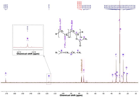 To confirm the results obtained by FTIR spectroscopy, the chemical structure of m-EVA40 was additionally investigated by liquid NMR spectroscopy. Preliminary analysis was performed by proton magnetic resonance to record the 1H-NMR spectrum. However, the data obtained are not indicative, since, due to the high number of –CH2– groups in the chemical structure of EVA, the dynamic range of the NMR spectrometer is reached very quickly and the low-intensity signal from hydrogen at the double bond either does not have time to be recorded or is blurred against the background of other signals, turning into noise, or merges into a single peak with the CH–O– fragment of the VA unit. In this regard, 13C-NMR is advisable for better resolution. Figure 4 shows a typical 13C-NMR spectrum recorded for the m-EVA40 sample in chloroform-d1 at room temperature. The spectral line sequences according to [25,26,27,28,29] are as follows (solvent signals are omitted)—13C-NMR (150.9 MHz, Chloroform-d1, δ in ppm): 171.01–170.73 (A), 117.42 (B), 74.57–74.19 (C), 71.52 (false positive), 70.39 (false positive), 38.58 (D), 34.96 (E), 34.27 (F), 34.07 (G), 33.66 (H), 30.22 (I), 29.83–29.78 (J), 29.72–29.57 (K), 29.34 (false positive), 26.86 (L), 25.45–25.38 (M), 25.27 (N), 21.39–21.34 (O), and 21.24–20.86 (P). It is evident that in m-EVA40, in addition to the main ethylene and VA groups, there are branches at the methine point (signal D) and methyl groups –CH3 (signal P). The methyl group is probably the terminal functional group in this copolymer, as shown in the work [25]. There are resonance signals related to carbon at the C=C bond (signal B), indicating the presence of C=C bonds in m-EVA40. The experimental data obtained by the liquid NMR spectroscopy method correlate with FTIR spectroscopy results.
