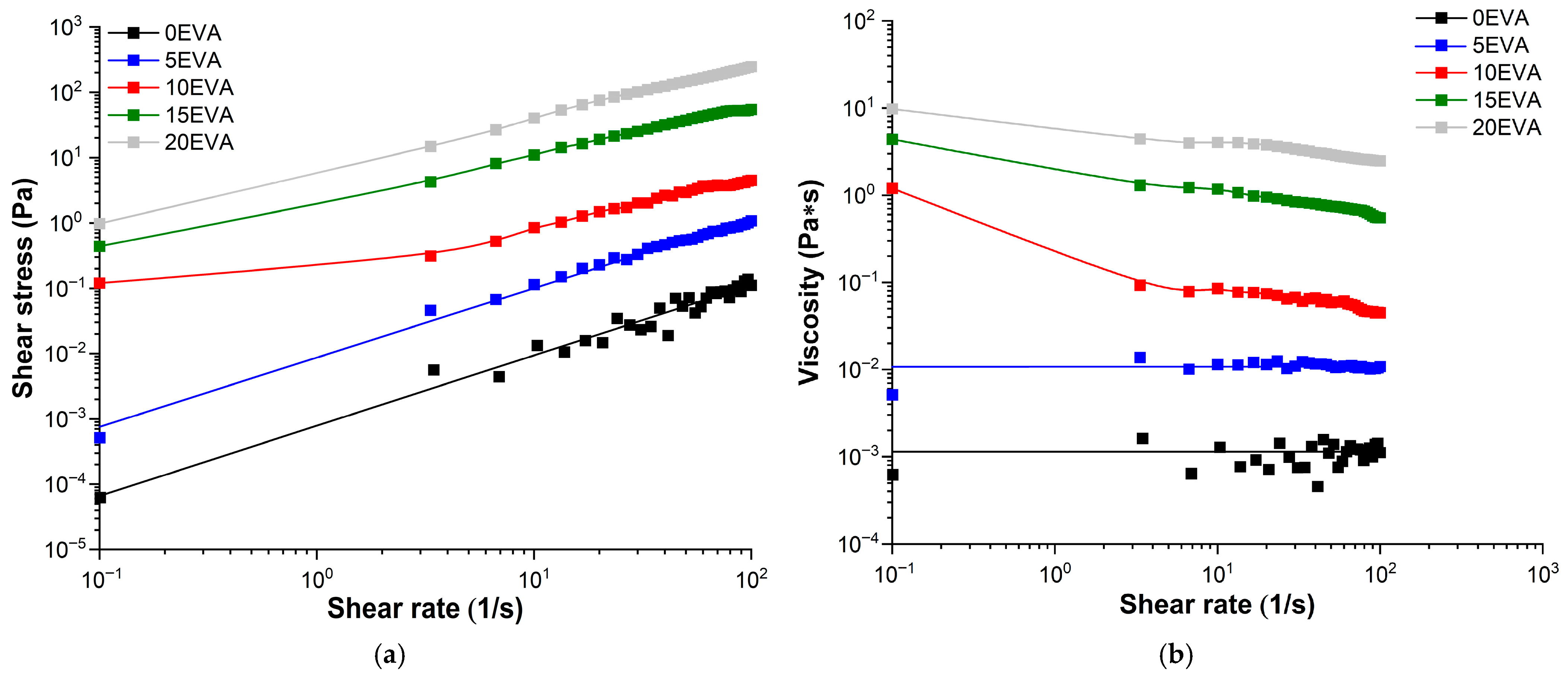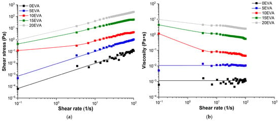 Based on the rheometry results, the rheological behavior of MPSC with a content of Сm-EVA40 < 10 mass. p. in the composition obeys Newton’s law of viscous friction (Equation (7)), and with Сm-EVA40 ≥ 10 mass. p., as it is described by the Ostwald–de Waele power law (Equation (8)) [30]: