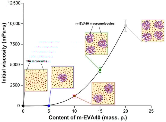 Dependence of the initial dynamic viscosity at 25 °C on the concentration of m-EVA40 in MPSCs. The insets in the figure schematically show the supramolecular structure of uncured MPSC of different content: the small red dots correspond to tBA molecules, and the purple coils correspond to m-EVA40 macromolecules.