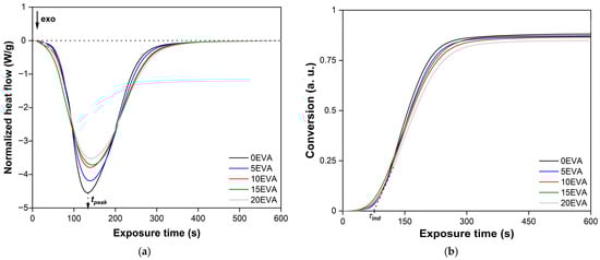 Figure 8 shows typical Photo-DSC isotherms of the photopolymerization process of the initial and modified MPSCs. It is evident that even with an m-EVA40 content of 20 mass. p. the system exhibits a stable photochemical polymerization reaction. The initial stage of photopolymerization of all MPSCs is characterized by an induction period (τind). After ~85 s, a sharp increase in the rate of the chemical reaction is observed on all isotherms, which was called the Trommsdorff–Norrish effect or the “gel effect” [31,32]. During the chemical reaction of photopolymerization, an exponential decrease in the heat flow from the reaction zone occurs, forming an extremum on the obtained curves, which is estimated as the time to reach the exothermic peak (τpeak). As a result, all curves reach a plateau within ~570 s after the start of irradiation, which is a sign of completion of the photochemical polymerization reaction corresponding to MPSC [31,32]. These observations are consistent with the results of studying the curing process of various acrylates and systems based on them [6,7,11,32,33]. The slowdown in the photopolymerization rate after reaching the peak value is explained by the fact that in MPSCs, viscosity increases over time during curing, the molecular weight increases, and gelation occurs. All this leads to a decrease in the mobility and a decrease in the diffusion of all components of the system, including reactive ones. Consequently, the rate of the photochemical polymerization reaction also decreases. In addition, the gradual consumption of C=C bonds, a decrease in the efficiency of BAPO as a result of photodegradation, and vitrification of the system at a later stage of the chemical reaction also contribute to a decrease in the photopolymerization rate until it stops. Another factor is associated with an increase in the glass transition temperature (Tg) of the polymer formed during the reaction, which leads to vitrification of the corresponding MPSC as soon as Tg exceeds the experimental temperature [5,6,7,21,22,23,24,25,26,27,28,29,30,31,32,33]. In the case of modified MPSCs, the rate of photochemical polymerization reaction is additionally affected by phenomena that may be related to the absorption and scattering of the lamp radiation from the attachment on the macromolecules of the thermoplastic modifier [5,11]. Based on the analysis of isotherms in α—texpos coordinates, integral kinetic curves of the photopolymerization process of the studied MPSCs were constructed (Figure 8b). It is evident that all curves have a classical S-shaped character [32]. The α(texpos) dependences clearly show τind and the inflection point corresponding to the maximum on the corresponding isotherm. These observations are an indication of the occurrence of an autocatalytic chemical reaction, which correlates with the results of studying the photopolymerization of other acrylate-based systems [6,7,11,32,33].