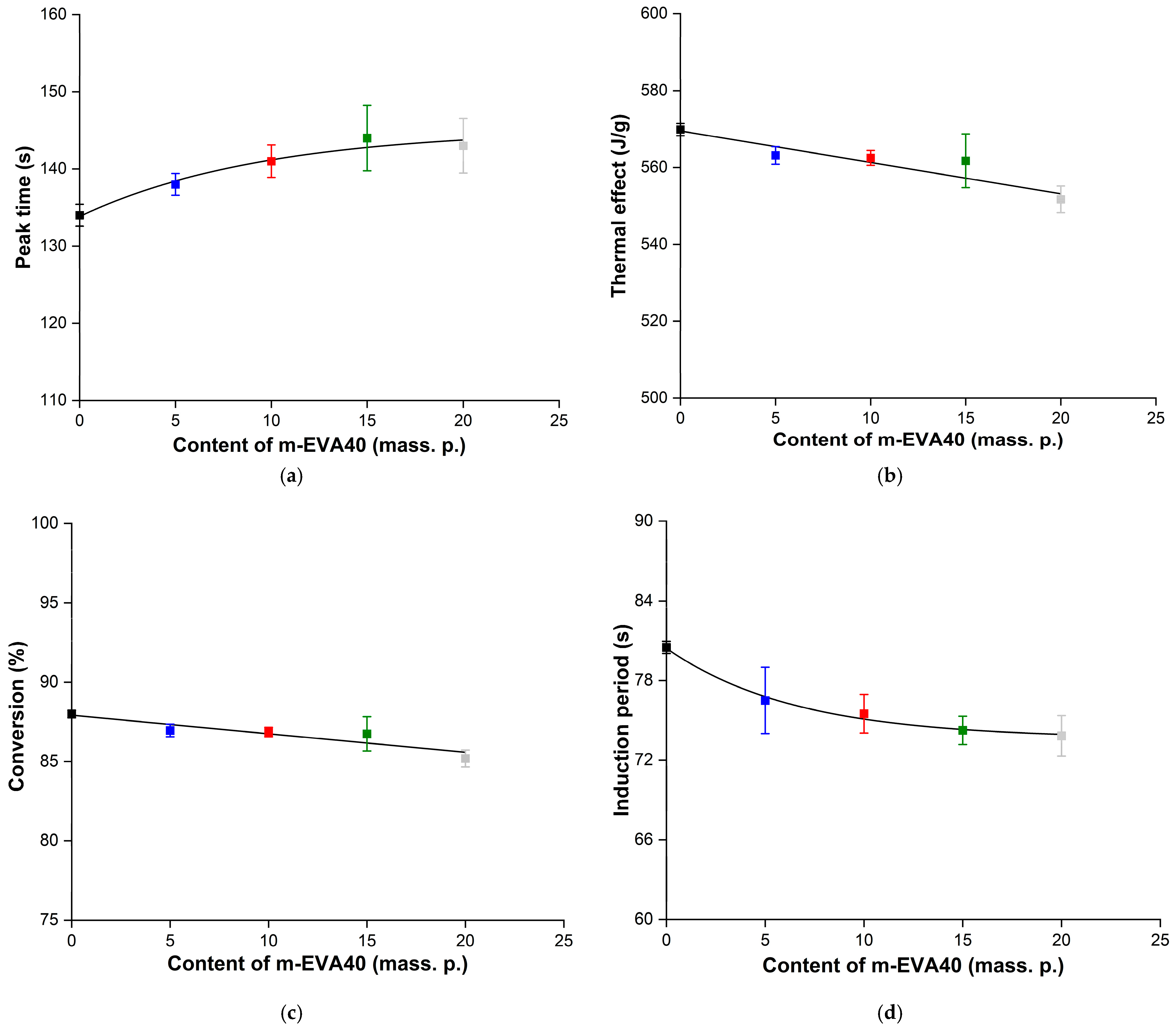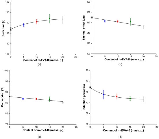 Effect of m-EVA40 concentration in MPSC on the following: (a) time to reach the exothermic peak upon irradiation; (b) thermal effect of photochemical polymerization reaction (per monomer); (c) degree of conversion (per monomer); and (d) induction period.