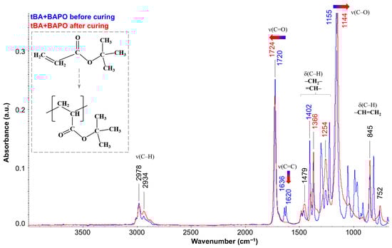 FTIR results at 25 °C: IR spectrum of tBA + BAPO before curing (blue spectrum) and after curing (red spectrum).