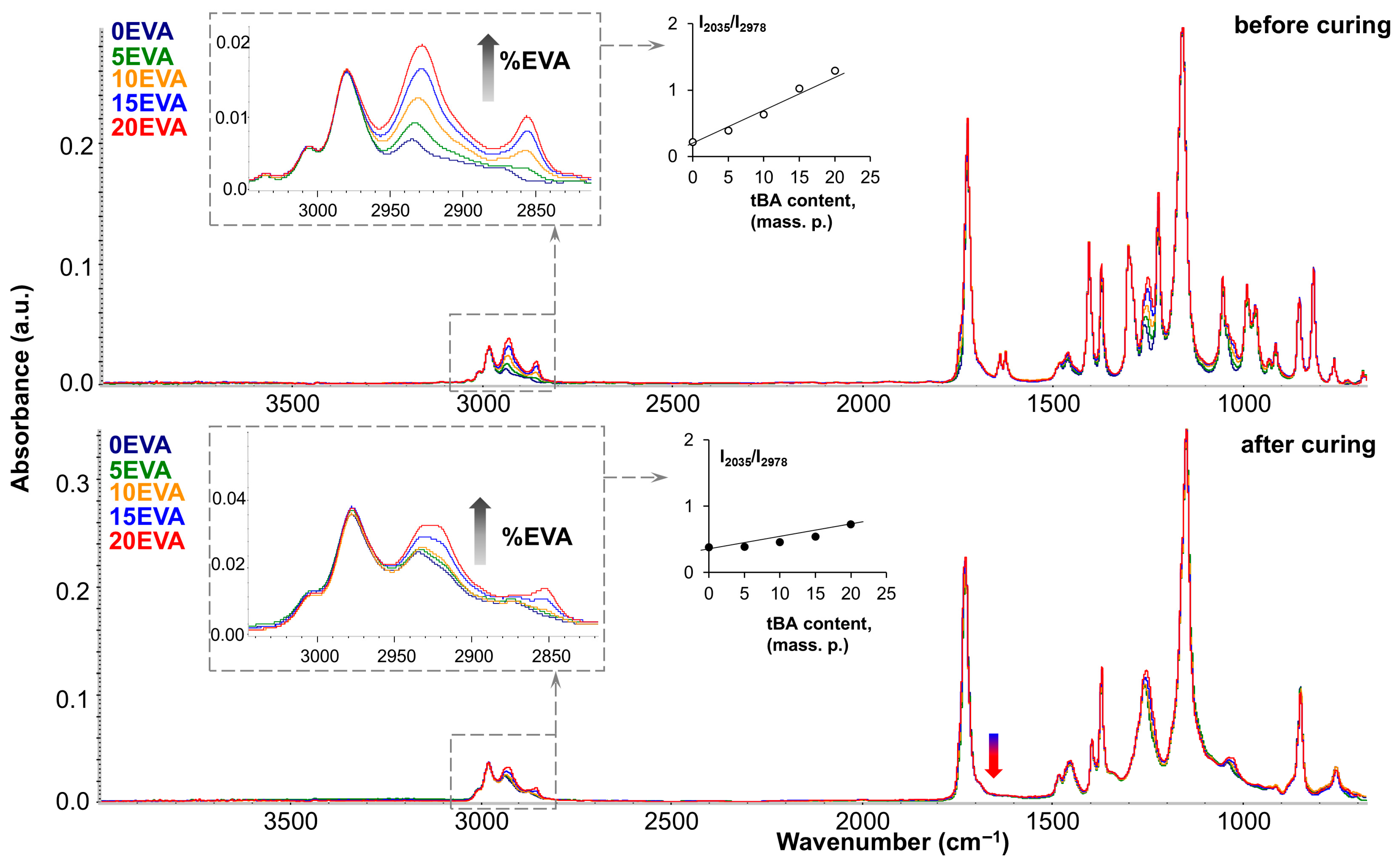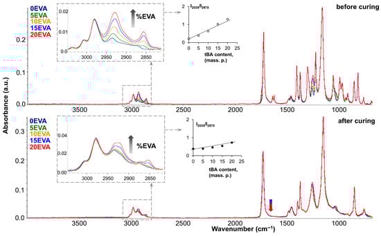 Figure 11 shows the FTIR spectra of the original and modified MPSCs before and after photocuring (top and bottom, respectively). As can be seen, the mixed spectra almost completely correspond to the spectrum of pure tBA monomer (dark blue spectrum). However, the introduction of m-EVA40 can be tracked by the increase in the intensity of such characteristic absorption bands as the stretching vibrations of the –CH2– group, which appear in the region of 2950–2800 cm−1. The inset on the left shows that the higher the content of the thermoplastic modifier in the system, the higher the intensity of these absorption peaks in the spectrum. A quantitative analysis of the 2930 cm−1 band growth was performed, and a plot of its change with increasing m-EVA40 content was plotted (shown in the center of Figure 11). The linear growth of this absorption band, both before and after curing, indicates that increasing the m-EVA40 content in the mixture does not affect the curing process of tBA. Such an effect can be observed for the absorption band in the region of 1250 cm−1 (stretching vibrations of C–O in the –C–C(=O)–O group), the intensity of which increases with the increase in the content of m-EVA40 in MPSC, and this peak also tends to shift to the right due to the fact that for pure m-EVA40 its position corresponds to 1238 cm−1. The carbonyl peak (1730–1720 cm−1) also increases slightly in intensity and broadens to the left. This is due to the fact that similar absorption bands of the two components (tBA and m-EVA40) in the original spectra have a slightly different position in wavenumber due to the influence of neighboring groups. For example, the carbonyl peak of m-EVA40 is localized at 1736 cm−1, while for tBA it is at 1720 cm−1. Accordingly, both peaks appear during mixing, and the corresponding changes in the spectrum can be seen in total. By additionally processing the IR spectra of the initial components tBA and m-EVA40, through their mathematical addition, simulated mixed spectra were obtained, which were completely identical to the experimentally obtained mixed spectra for MPSCs. All this proves that no interactions or transformations occur during the mixing of tBA and m-EVA40. After photocuring, the mixed spectra also differ only in the intensity of the characteristic bands of m-EVA40, as was the case for the mixed spectra before curing. This suggests that m-EVA40 is potentially present before and after curing as an additional component that does not participate in crosslinking. It is important to emphasize that the obtained mixtures were obtained using m-EVA40, which is characterized by the presence of C=C double bonds, and the absorption bands of C=C bonds in the mixed spectra after curing completely disappear (indicated by the blue–red arrow in Figure 11). This may be the result of the fact that there are too few C=C double bonds in m-EVA40, and its potential participation in copolymerization with tBA does not lead to the formation of a dense network.
