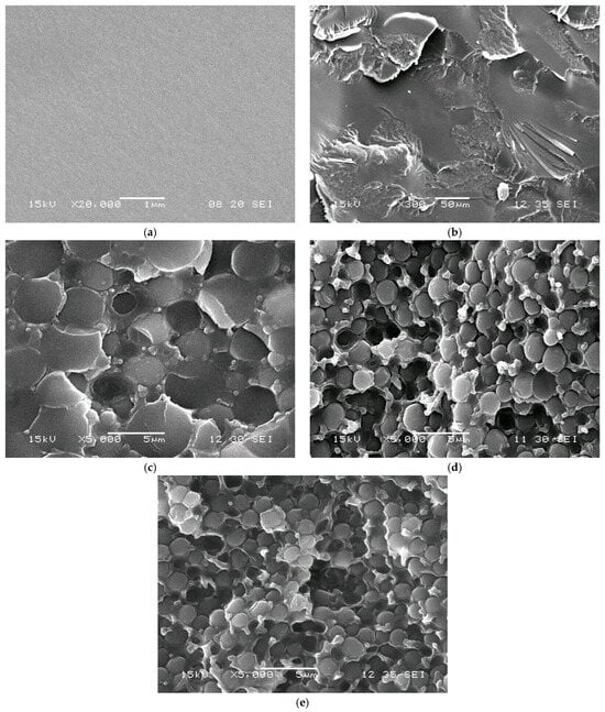 The SEM images of cured MPSCs with different m-EVA40 contents: (a) 0; (b) 5; (c) 10; (d) 15; and (e) 20 mass. p.